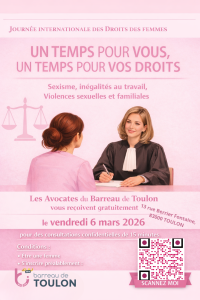 Les avocates du Barreau de TOULON vous reçoivent gratuitement et confidentiellement pendant 15 minutes de 9h à 17h à la Maison de l'Avocat, 13 rue Berrier Fontaine à Toulon.